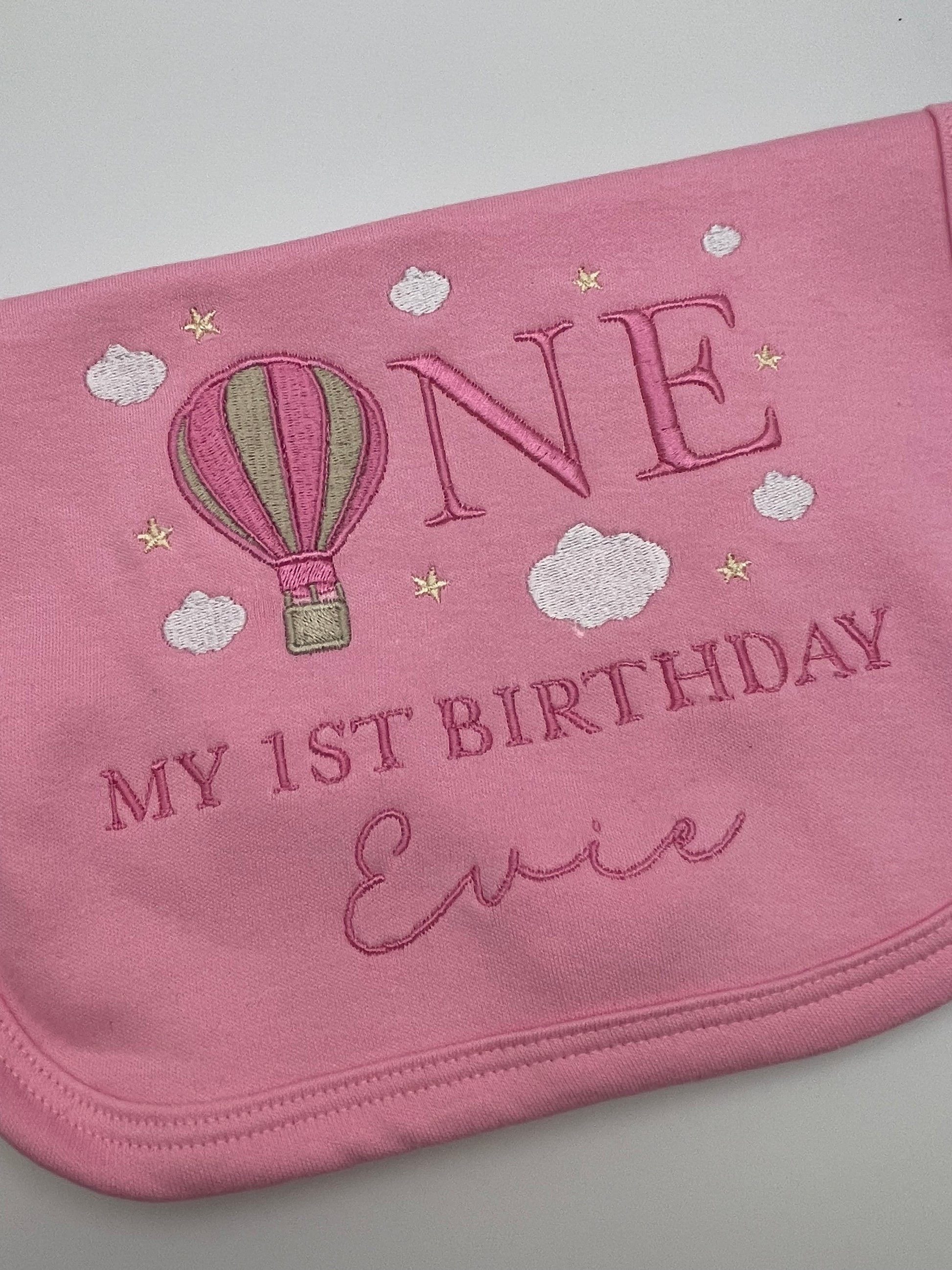 1st Birthday Baby Bib Embroidered in the sky design, Personalised add your child's name