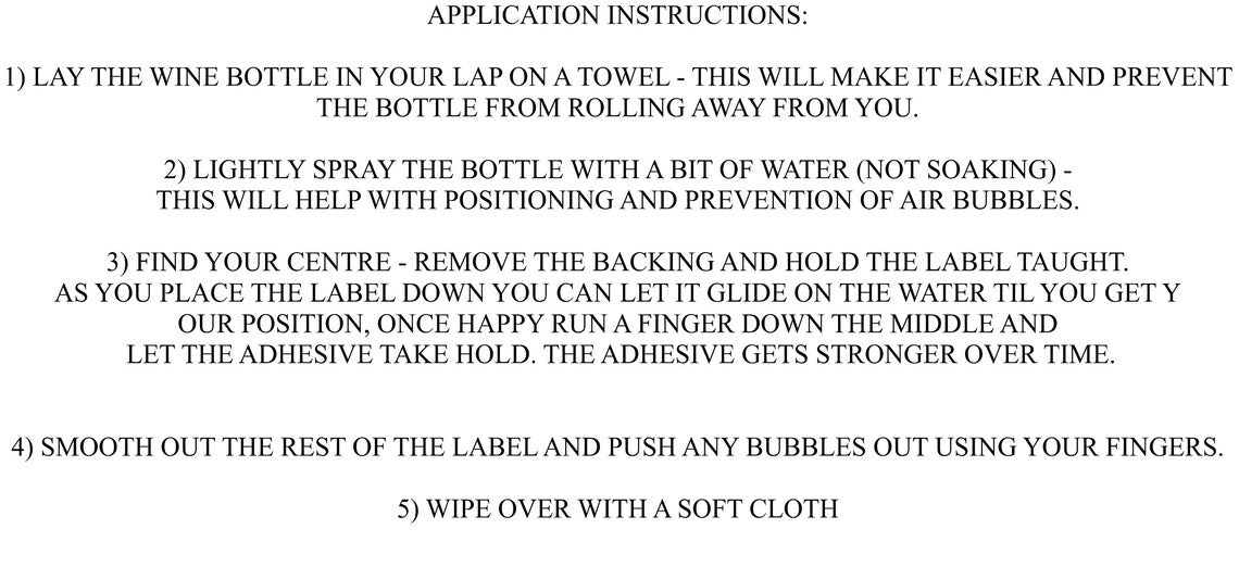 The label will feature a coloured background. The label will read "NAME" Hen party, Place and date The labels will measure 80mm wide by 50mm high stickers are self adhesive, have a gloss finish and are water resistant. These are printed using a professional printer and are machine cut. It is recommended that you remove the existing label and glue residue from your wine bottle before applying. You can do this by soaking in warm water, ensure the bottle is clean and dry before applying the label.