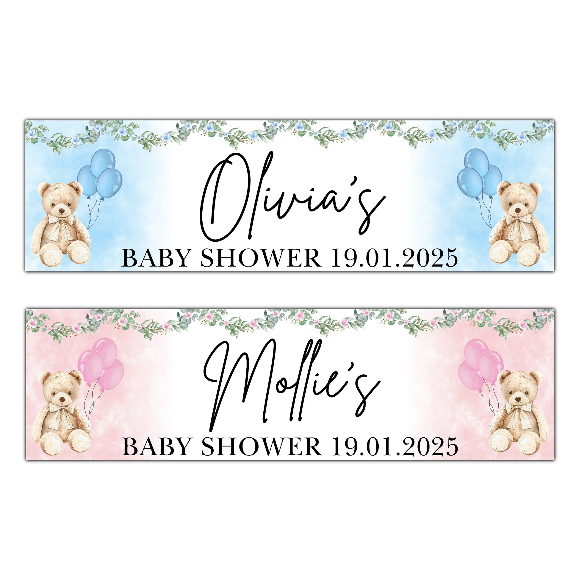 The banner will feature a Teddy bear and Flowers in either Pink or Blue and is personalised with Name, baby shower and Date as shown in the pictures.