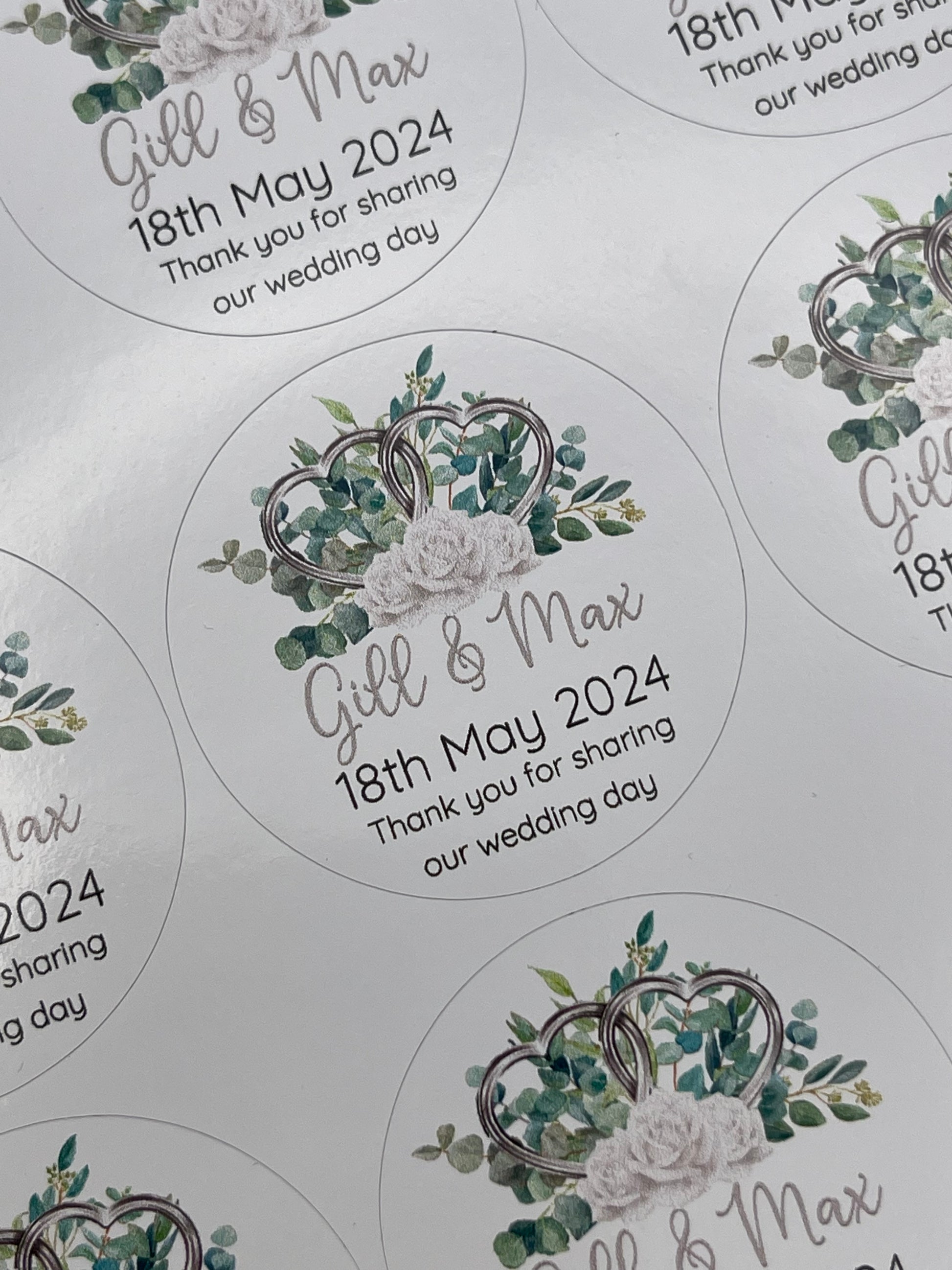 The stickers feature either a gold or silver double heart with Eucalyptus image with Names, Date and thank you for Celebrating with us underneath They are Round Stickers and the material is gloss vinyl with a permanent adhesive.