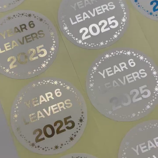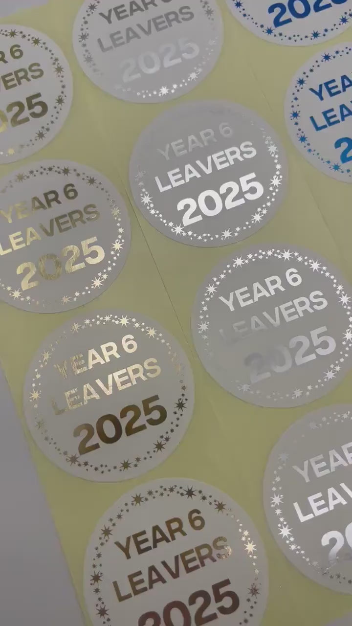 The stickers feature a Stars design round the edge and has year 6 leavers 2025.